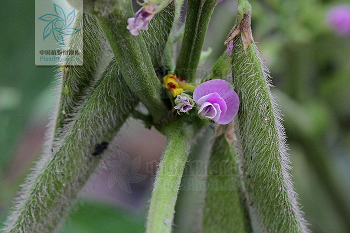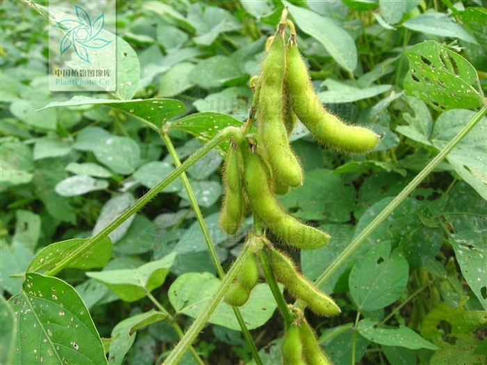 大豆 Glycine max (L.) Merr. 一年生草本。茎直立,有时上部近缠绕状。3小叶,宽卵形、近圆形或椭圆状披针形,先端渐尖或近圆,基部宽楔形或近圆,侧生小叶偏斜。总状花序腋生。花冠紫、淡紫或白色,旗瓣倒卵圆形,反折,翼瓣长圆形,短于旗瓣,龙骨瓣斜倒卵形,短于翼瓣;子房基部具明显的腺体。荚果长圆形。种子椭圆形或近卵球形,光滑,颜色因品种而异。原产我国,亦广泛栽培于世界各地。为我国重要粮食及油料作物。 大豆含脂肪约20%,蛋白质约40%,还含有丰富的维生素,富含营养,除供直接食用外,可作酱、酱油和各种豆制食品;茎、叶、豆粕及粗豆粉作肥料和优良的牲畜饲料。 一年生草本,高30-90厘米。茎粗壮,直立,或上部近缠绕状,上部多少具棱,密被褐色长硬毛。叶通常具3小叶;托叶宽卵形,渐尖,长3-7毫米,具脉纹,被黄色柔毛;叶柄长2-20厘米,幼嫩时散生疏柔毛或具棱并被长硬毛;小叶纸质,宽卵形,近圆形或椭圆状披针形,顶生一枚较大,长5-12厘米,宽2.5-8厘米,先端渐尖或近圆形,稀有钝形,具小尖凸,基部宽楔形或圆形,侧生小叶较小,斜卵形,通常两面散生糙毛或下面无毛;侧脉每边5条;小托叶铍针形,长1-2毫米;小叶柄长1.5-4毫米,被黄褐色长硬毛。总状花序短的少花,长的多花;总花梗长10-35毫米或更长,通常有5-8朵无柄、紧挤的花,植株下部的花有时单生或成对生于叶腋间;苞片披针形,长2-3毫米,被糙伏毛;小苞片披针形,长2-3毫米,被伏贴的刚毛;花萼长4-6毫米,密被长硬毛或糙伏毛,常深裂成二唇形,裂片5,披针形,上部2裂片常合生至中部以上,下部3裂片分离,均密被白色长柔毛,花紫色、淡紫色或白色,长4.5-8(-10)毫米,旗瓣倒卵状近圆形,先端微凹并通常外反,基部具瓣柄,翼瓣蓖状,基部狭,具瓣柄和耳,龙骨瓣斜倒卵形,具短瓣柄;雄蕊二体;子房基部有不发达的腺体,被毛。荚果肥大,长圆形,稍弯,下垂,黄绿色,长4-7.5厘米,宽8-15毫米,密被褐黄色长毛;种子2-5颗,椭圆形、近球形,卵圆形至长圆形,长约1厘米,宽约5-8毫米,种皮光滑,淡绿、黄、褐和黑色等多样,因品种而异,种脐明显,椭圆形。花期6-7月,果期7-9月。 原产我国。全国各地均有栽培,以东北最著名,亦广泛栽培于世界各地。 大豆是我国重要粮食作物之一,已有五千年栽培历史,通常被认为是由野大豆Glycine soja Sieb. et Zucc. 驯化而来,现知约有1000个栽培品种。 豆粕经加工制成的组织蛋白、浓缩蛋白、分离蛋白和纤维蛋白可为多种食品,如人造肉、干酪素、味精及造纸、塑胶工业、人造纤维、火药等的原料。豆油除主要供食用外,并为润滑油、油漆、肥皂、瓷釉、人造橡胶、防腐剂等重要原料。榨油后的下脚料可提出许多重要产品,如用于食品工业的磷脂以及利用豆甾醇、谷甾醇为医药工业取得廉价的甾醇激素原料。大豆在工业上用途约有500种以上。此外药用有滋补养心、祛风明目、清热利水、活血解毒等功效。