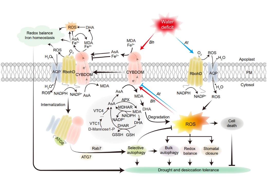中国科学院植物研究所邓馨研究组以我国分布的复苏植物旋蒴苣苔(Boea hygrometrica)和模式植物拟南芥作为研究对象,发现了旋蒴苣苔细胞质膜上的CYBDOM蛋白BhDB及其拟南芥同源蛋白AtDB1与NADPH氧化酶RbohD互作,促进了RbohD与自噬相关蛋白ATG8以及货物蛋白水通道蛋白PIP2;7的结合,最终激活PIP2;7选择性自噬的一条新途径。该途径能够减少H₂O₂信号的产生和积累,重建细胞质膜内外的氧化还原平衡,从而增强植物的抗旱性,提高植物抗旱阈值。