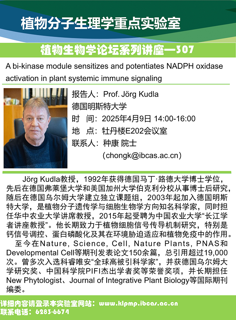4月9日植物生物学论坛—307:A bi-kinase module sensitizes and potentiates NADPH oxidase activation in plant systemic immune signaling