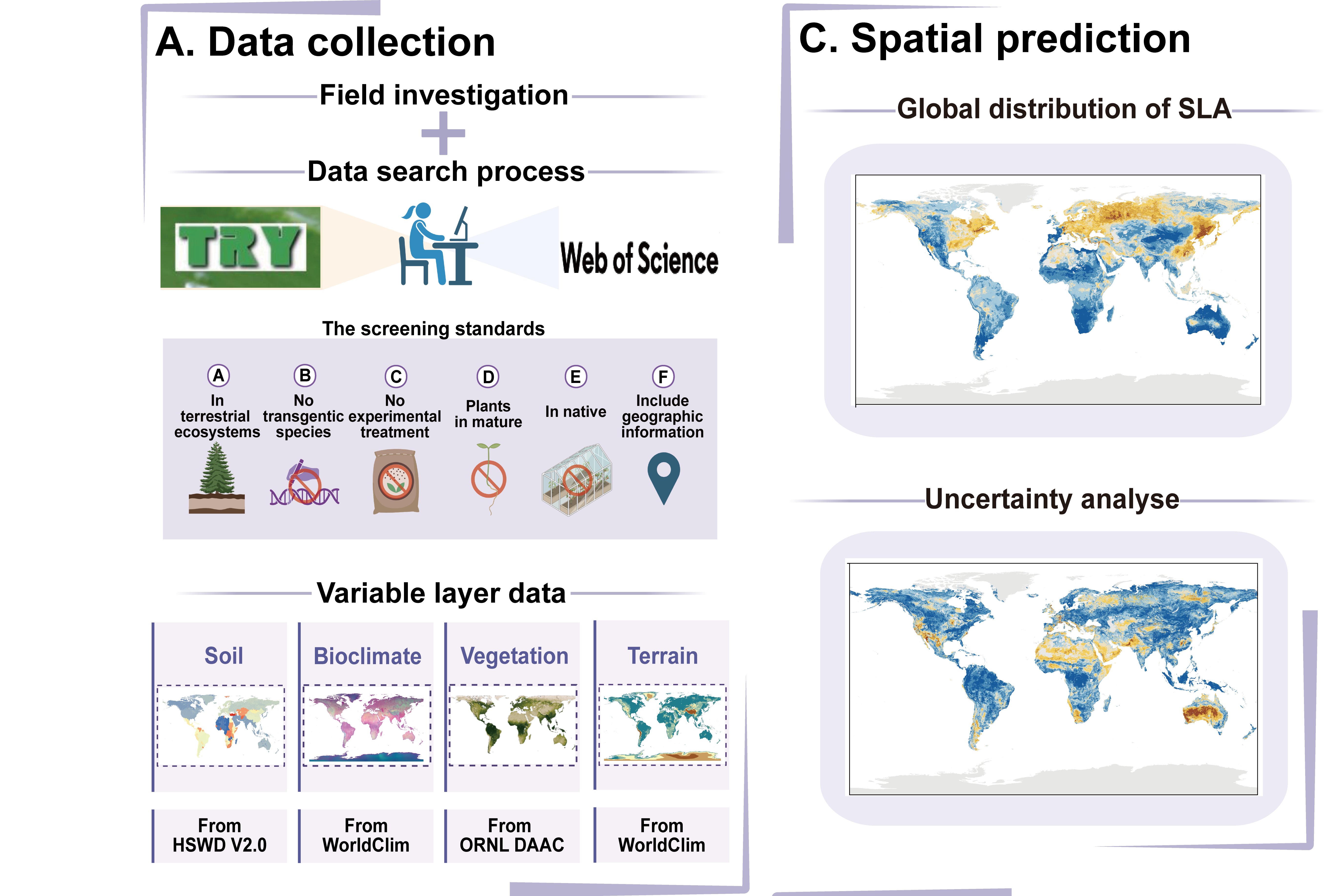比叶面积(SLA)是表征植物叶片形态结构、生理功能与资源利用策略的关键功能性状,其与叶片大小、组织密度、养分含量、光合活性等密切相关,对于模拟大尺度植被分布规律、生态系统功能和生物地球化学过程(如碳循环)具有重要价值。但SLA在全球尺度上的连续空间分布格局,尤其是在未来气候变化...