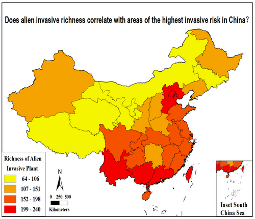 基于该图提出以下思考:我国入侵物种最丰富的南方地区(云南,广西和广东等省)的入侵风险是否最严重?综合评估结果认为:我国各省入侵风险的高危地区是我国的东部居中或沿海地区,在全球变暖背景下,北纬33°线以北的河北、山东、河南和江苏省的入侵植物防治工作更应受到更高度地重视。