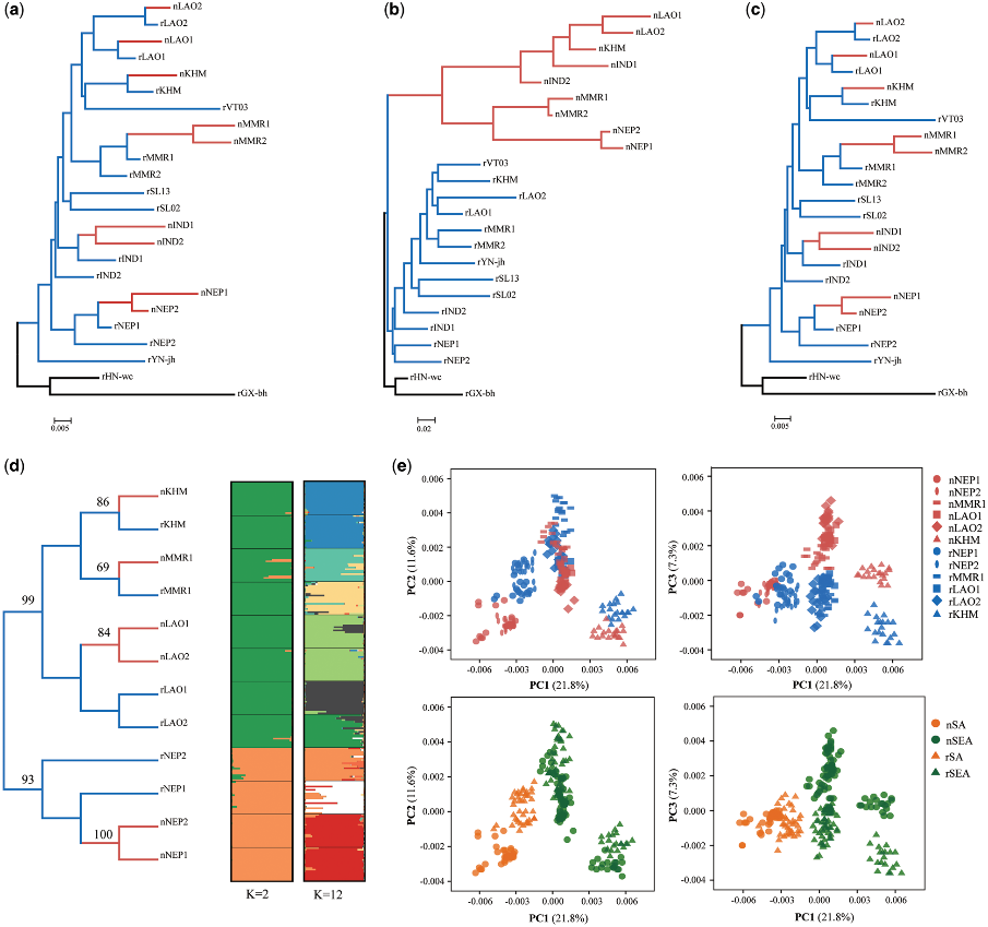 群体重测序(上图)和中性基因数据(下图)均表明新种O. nivara(红色)