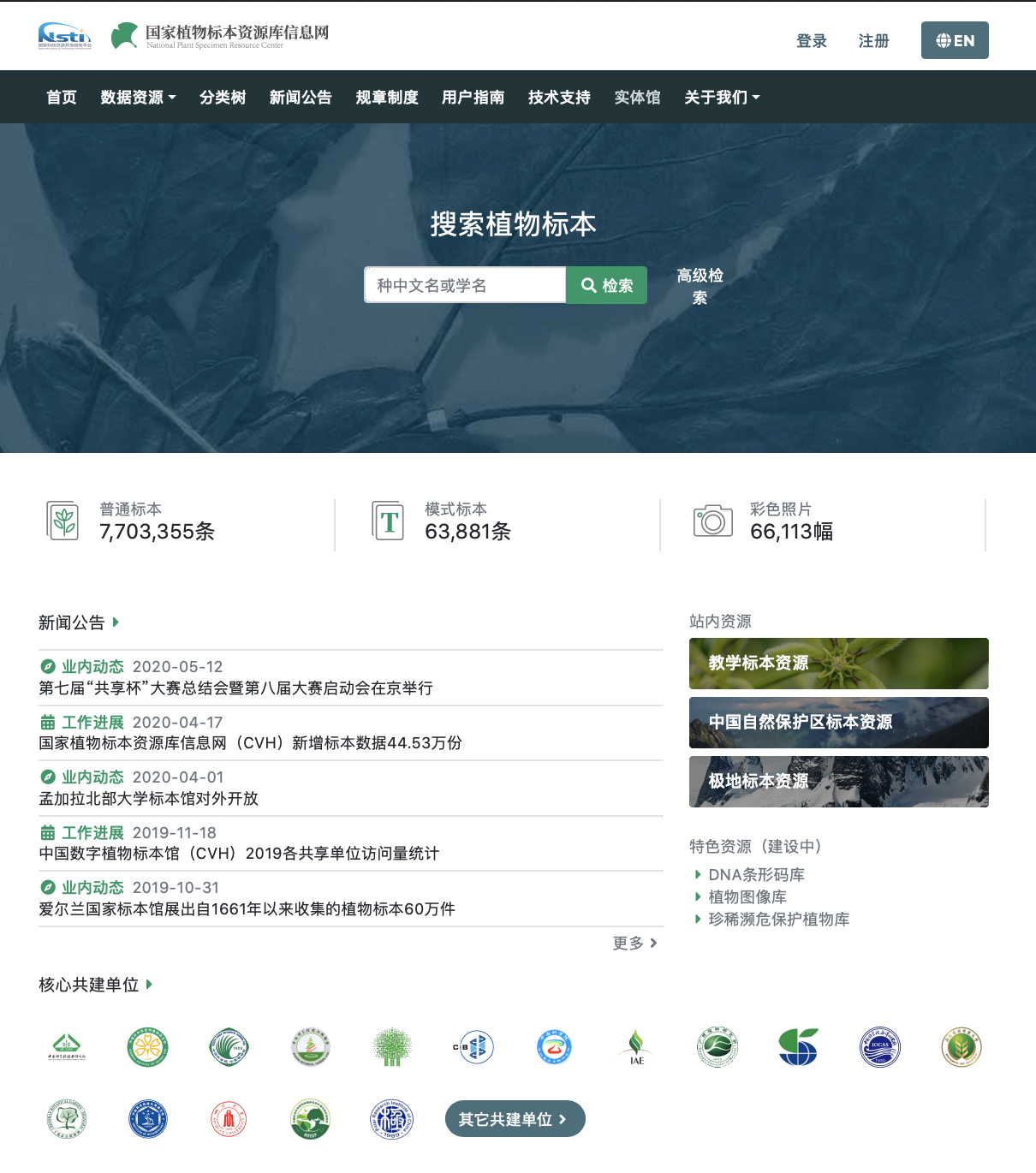 国家植物标本资源库信息网是面向社会的科技资源在线服务系统,也是资源库进行项目管理、技术支持、资源展示及信息共享的平台。该网站在保留原有CVH各项功能基础上,增强了数字资源的可视化展示、提供了以Darwin Core为基础的规范化数据接口,实现了与中国科技资源共享网的多项对接,同时设置了实体标本馆相关信息的查询与管理功能。此外,该网站对页面版式进行了全新设计,其响应式的页面在智能手机上有更好的显示效果,且为绝大多数功能添加了英文一键翻译。