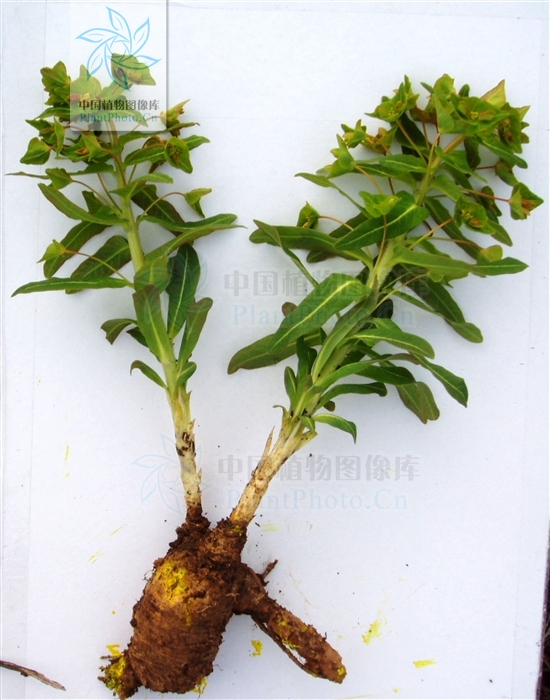 狼毒 Euphorbia fischeriana Steud. 多年生草本。根圆柱状,肉质,常分枝。叶互生,茎下部叶鳞片状,卵状长圆形,茎生叶长圆形。长总苞叶常5,伞辐5,次苞叶2,三角状卵形。花序单生二歧分枝顶端,无梗;总苞钟状,边缘圆形4裂,被毛;腺体4,半圆形,淡褐色。雄花多枚,伸出总苞;花柱中下部合生。蒴果卵圆形,被毛,具果柄;花柱宿存。种子扁球状,灰褐色。花果期5-7月。产于东北至山东沿海地区的低海拔草原、干燥丘陵坡地、多石砾干山坡及阳坡松林下。分布于蒙古及东西伯利亚地区。根入药,全株有毒。 全株有毒,根可入药。 多年生草本,除生殖器官外无毛。根圆柱状,肉质,常分枝,长20-30厘米,直径4-6厘米。茎单一不分枝,高15-45厘米,直径5-7毫米。叶互生,于茎下部鳞片状,呈卵状长圆形,长1-2厘米,宽4-6毫米,向上渐大,逐渐过渡到正常茎生叶;茎生叶长圆形,长4-6.5厘米,宽1-2厘米,先端圆或尖,基部近平截,侧脉羽状不明显;无叶柄;总苞叶同茎生叶,常5枚;伞幅5,长4-6厘米;次级总苞叶常3枚,卵形,长约4厘米,宽约2厘米;苞叶2枚,三角状卵形,长与宽均约2厘米,先端尖,基部近平截。序单生二歧分枝的顶端,无柄;总苞钟状,具白色柔毛,高约4毫米,直径4-5毫米,边缘4裂,裂片圆形,具白色柔毛;腺体4,半圆形,淡褐色。雄花多枚,伸出总苞之外;雌花1枚,子房柄长3-5毫米;子房密被白色长柔毛;花柱3,中部以下合生;柱头不分裂,中部微凹。蒴果卵球状,长约6 毫米,直径6-7毫米,被白色长柔毛;果柄长达5毫米;花柱宿存;成熟时分裂为3个分果爿。种子扁球状,长与直径均约4毫米,灰褐色,腹面条纹不清;种阜无柄。花果期5-7月。 产于黑龙江、吉林、辽宁、内蒙古(东部)和山东(烟台、崂山)。生于海拔100-600米的草原、干燥丘陵坡地、多石砾干山坡及阳坡稀疏的松林下。分布于蒙古和俄罗斯(东西伯利亚)模式标本采自达乌里。 根入药,主治结核类、疮瘘癣类等。