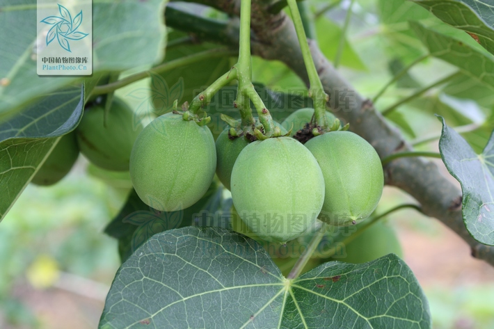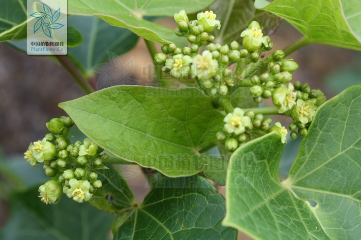 麻疯树 Jatropha curcas L. 小乔木或灌木状;具水液。叶纸质,卵圆形,先端短尖,基部心形,全缘或3-5浅裂,老叶无毛。花序腋生,苞片披针形。雄花,花瓣长圆形,合生至中部,雄蕊10,外轮5枚离生,内轮下部花丝合生;雌花萼片离生,花瓣腺体芍雄花同,子房3室,花柱顶端2裂。蒴果椭圆状球形,黄色。种子椭圆形,黑色。花期9-10月。原产美洲热带;现广布于全球热带地区。种子含油量高,油供工业或医药用。 又名小桐子,种子含油量高,油供工业或医药用。 灌木或小乔木,高2-5米,具水状液汁,树皮平滑;枝条苍灰色,无毛,疏生突起皮孔,髓部大。叶纸质,近圆形至卵圆形,长7-18厘米,宽6-16厘米,顶端短尖,基部心形,全缘或3-5浅裂,上面亮绿色,无毛,下面灰绿色,初沿脉被微柔毛,后变无毛;掌状脉5-7;叶柄长6-18厘米;托叶小。花序腋生,长6-10厘米,苞片披针形,长4-8毫米;雄花:萼片5枚,长约4毫米,基部合生;花瓣长圆形,黄绿色,长约6毫米,合生至中部,内面被毛;腺体5枚,近圆柱状;雄蕊10枚,外轮5枚离生,内轮花丝下部合生;雌花:花梗花后伸长;萼片离生,花后长约6毫米;花瓣和腺体与雄花同;子房3室,无毛,花柱顶端2裂。蒴果椭圆状或球形,长2.5 -3厘米,黄色;种子椭圆状,长1.5-2厘米,黑色。花期9-10月。 原产美洲热带;现广布于全球热带地区。我国福建、台湾、广东、海南、广西、贵州、四川、云南等省区有栽培或少量逸为野生。