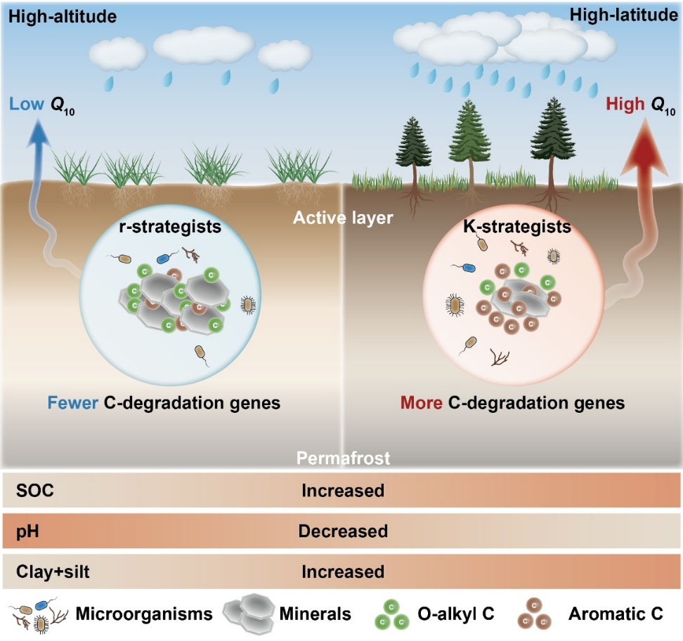 中国科学院植物研究所杨元合研究团队以高纬度(中国东北)和高海拔(青藏高原)多年冻土区为研究对象,基于野外样带调查、室内长期培养、数据整合分析以及高通量qPCR芯片等方法,揭示了不同多年冻土区表层土壤碳分解Q10的差异及其关键驱动因素。科研人员发现,高纬度多年冻土区表层土壤碳分解Q10显著高于高海拔多年冻土区,约为后者的1.8倍。进一步研究发现,土壤微生物属性和矿物保护是导致多年冻土区土壤碳分解Q10区域分异的直接驱动因素。高纬度多年冻土区表现出“较高的α多样性、较大的寡营养型微生物占比、较高的碳降解基因水平以及较弱的矿物保护作用”等特征,进而导致其Q10显著高于高海拔多年冻土区。该研究提供了不同多年冻土区土壤碳分解Q10的标准化数据集,拓展了学术界对冻土区土壤碳分解Q10驱动机制的认识,为提高模型对气候变暖背景下冻土碳释放的预测能力奠定了理论基础。