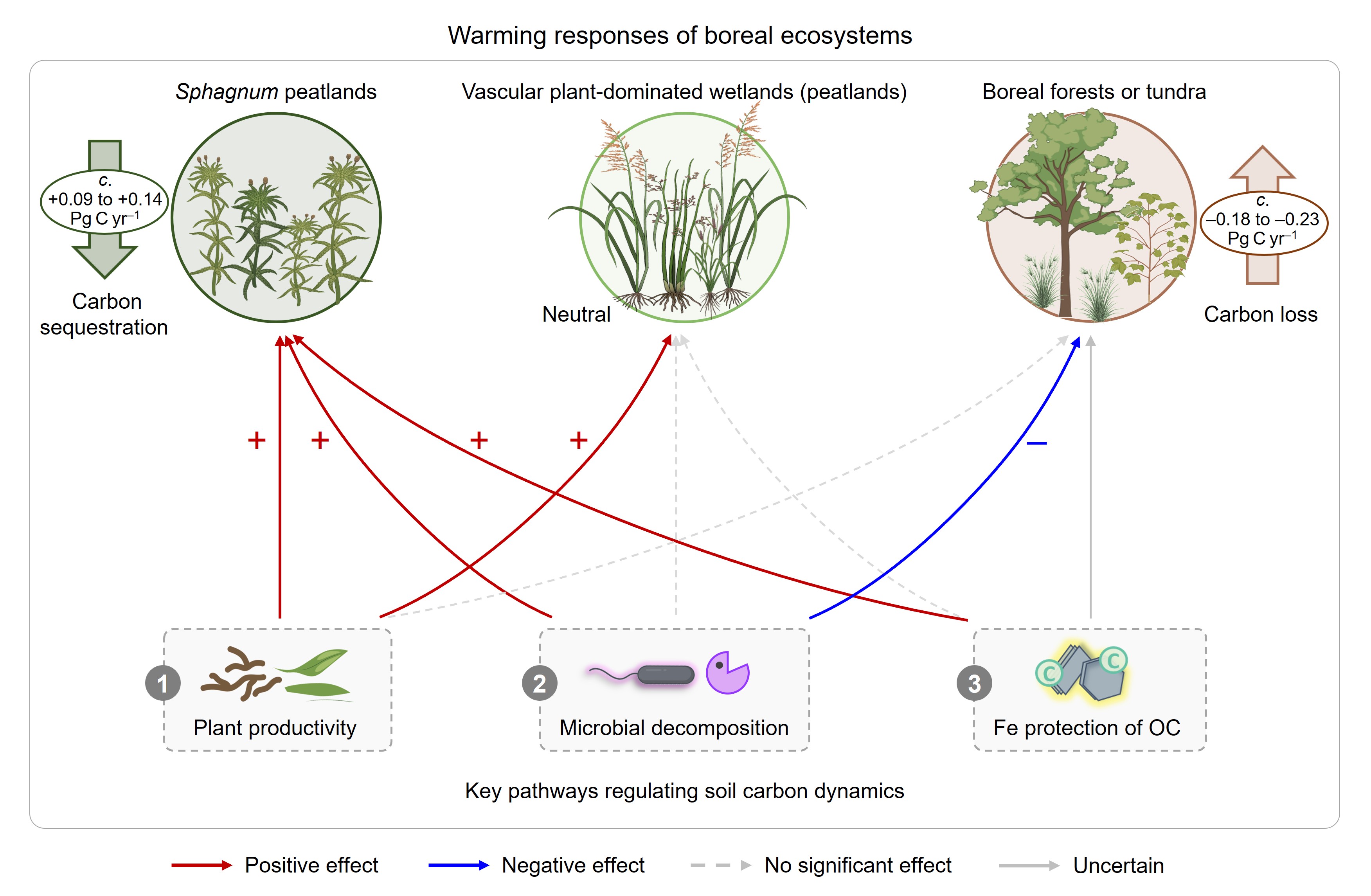 中国科学院植物研究所冯晓娟研究团队联合芬兰赫尔辛基大学及芬兰气象局等单位,依托芬兰两个野外长期(6—16年)增温实验平台,结合涵盖93项野外增温研究的整合分析,从植物输入、微生物分解与金属氧化物保护等途径,对比了增温背景下北方泥炭藓湿地与北方森林、苔原等生态系统土壤碳动态的响应差异及其调控机制。