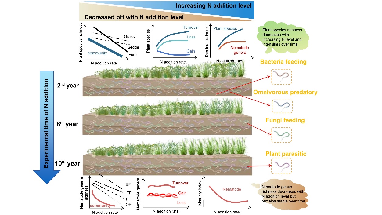 氮沉降增加是全球变化背景下影响陆地生态系统结构与功能的重要驱动力之一,已被证实可显著改变植物群落组成并威胁生物多样性。然而,作为草地生态系统关键组成部分的地下生物群落,其对长期氮富集的响应过程及其与地上植物群落之间的协同或解耦关系,仍缺乏系统认识。