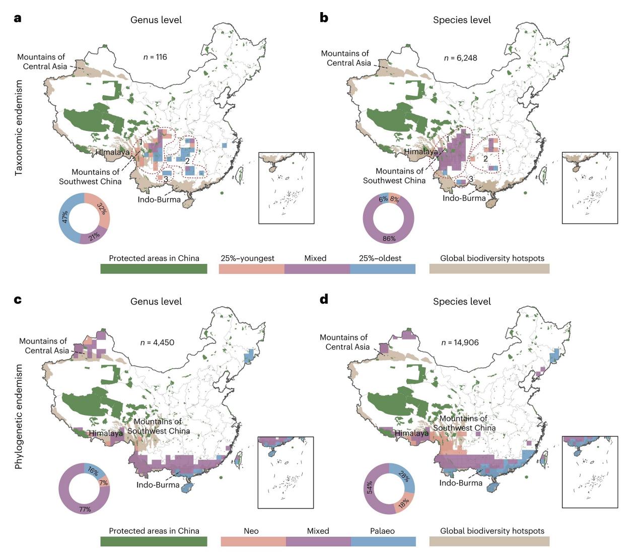研究发现,中新世与更新世分别是特有属与特有种形成与快速分化的关键时期。从空间格局看,基于特有类群识别的特有中心集中于横断山区、华中及滇黔桂喀斯特区域,而系统发生特有中心则广布于中国南部、西南,以及天山-阿尔泰山和长白山等区域(图2)。两类特有中心在空间分布上显著错位,提示保护规划中需兼顾物种数量与演化历史两个维度。