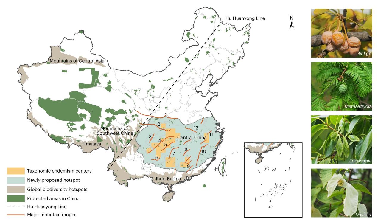 在此基础上,研究团队将特有中心与现有保护地及全球生物多样性热点叠加分析发现,华中地区是一个长期被忽视的保护空缺(图3)。该地区面积约154万平方公里,位于东亚亚热带常绿阔叶林生态区,拥有维管植物超过14431种,其中至少2024种为该区域特有,而其原始自然植被覆盖率仅为7%,完全符合全球生物多样性热点划定标准(拥有至少1500种特有维管植物,且原始自然植被留存率≤30%)。据此,研究团队提出,应尽快将华中地区正式认定为全球生物多样性热点,以提升其在国际保护体系中的战略地位,推动开展更为系统化、精准化的保护行动。