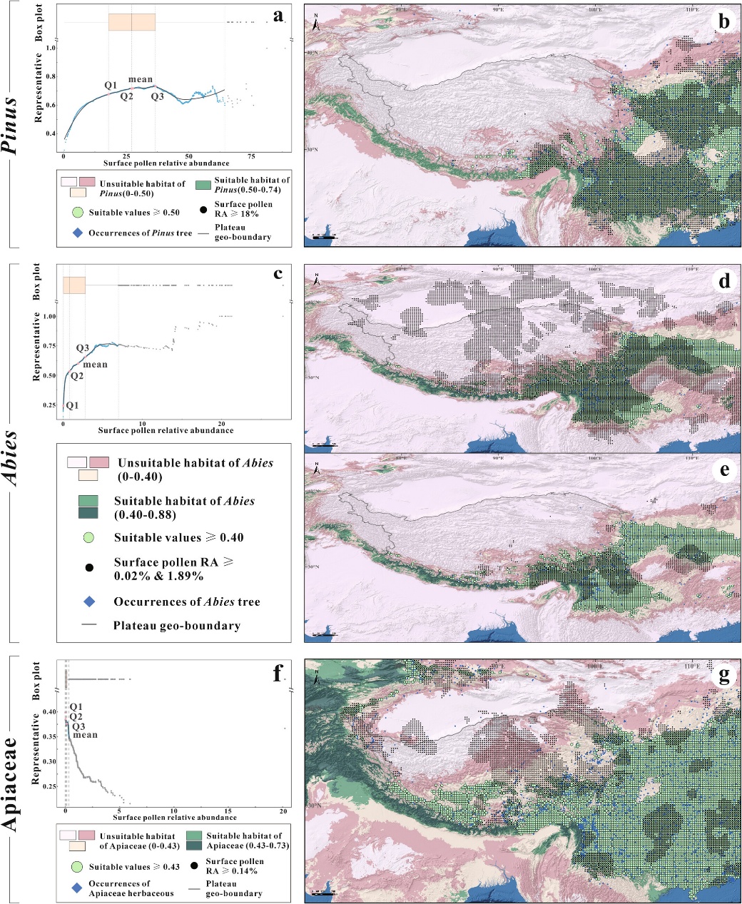 青藏高原及周边地区松属(a)、冷杉属(c)与伞形科(f)花粉相对丰度的代表性,以及三者各自花粉相对丰度与植物分布的空间格局(依次对应b、d和e、g)。